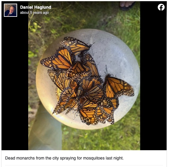 Mosquito-control insecticides have been linked with declines of native pollinators. In 2020, thousands of monarchs passing through North Dakota and Minnesota on their epic migration ran into a cloud of the insecticide permethrin—and perished. Researchers have also documented widespread contamination of honey bee hives with toxic pyrethroids.